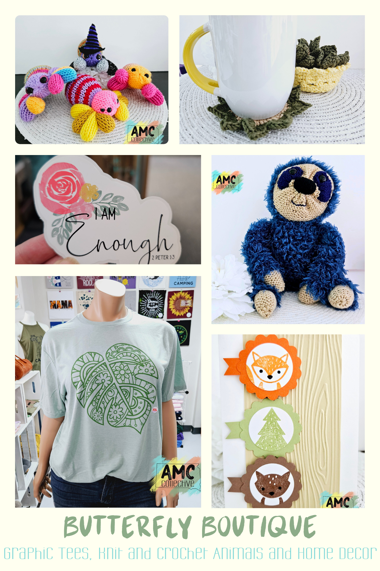 Carrie, the owner of Butterfly Boutique, has always loved creating. She started making graphic tees four years ago and later expanded into crochet and knitting machine projects, crafting items like faux plants, stuffed animals, and cozy decor. Crafting is her way to relax, and she finds joy in transforming simple materials into something special.