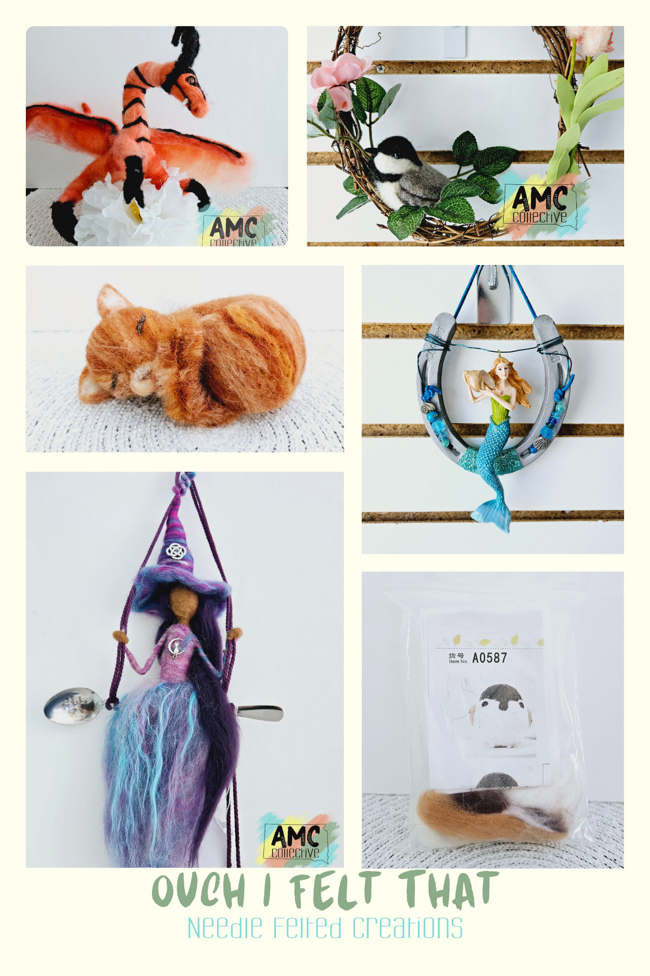 Kathryn Daniels, the artist behind Ouch I Felt That, discovered her love for felting three years ago and hasn’t looked back since. She’s drawn to the calming nature of the craft and the endless possibilities that come with working with fiber. From whimsical animals to imaginative scenes, her needle-felted creations are full of character and charm.