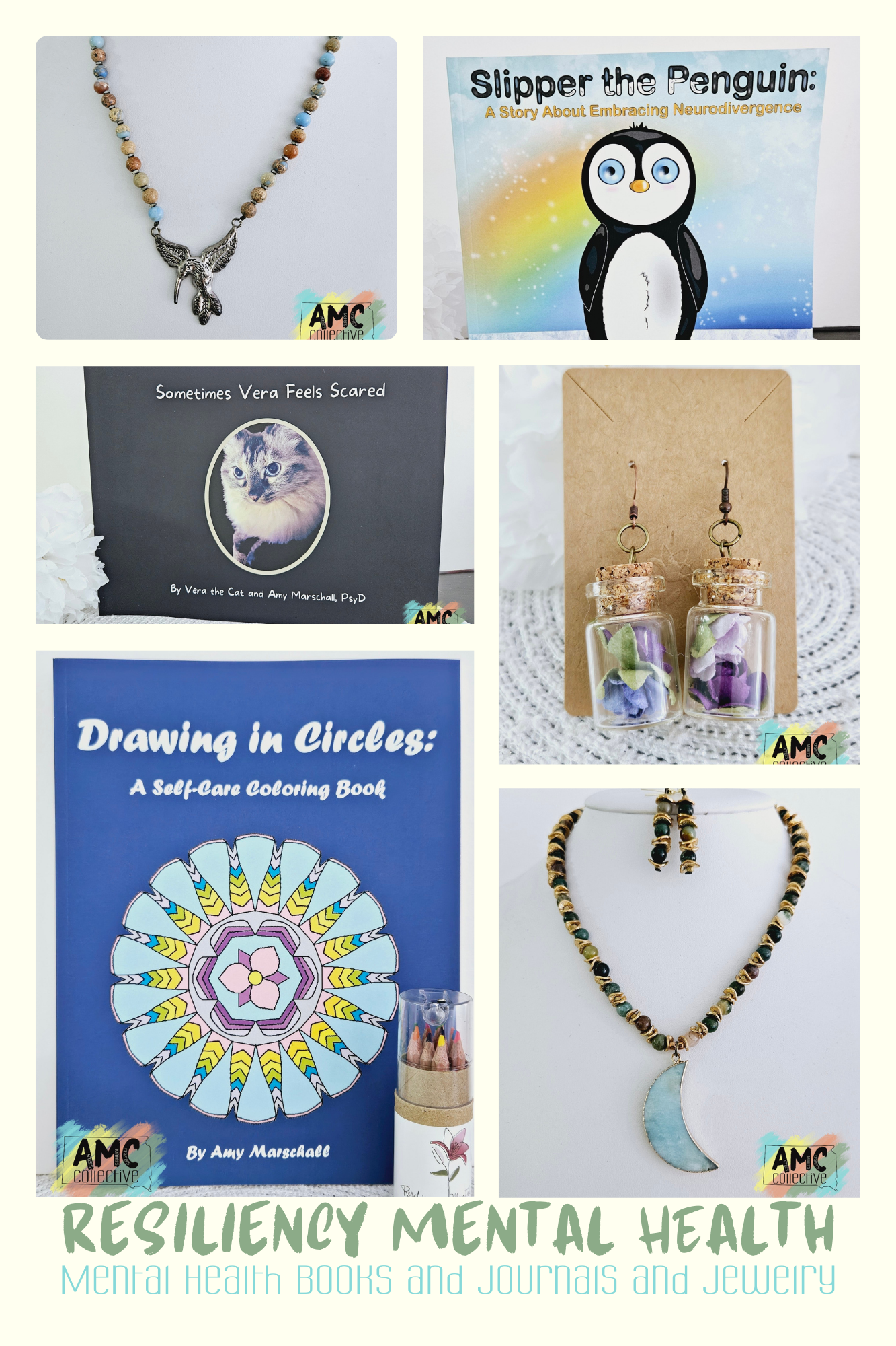 Mental Health books and Journals as well as jewelry.