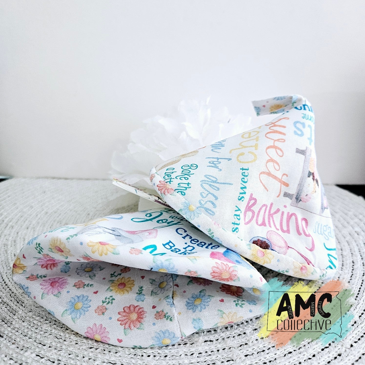 Impress your guests with these hot pan holders! Cone shaped for easy handle manipulation. Cute baking themed pattern!