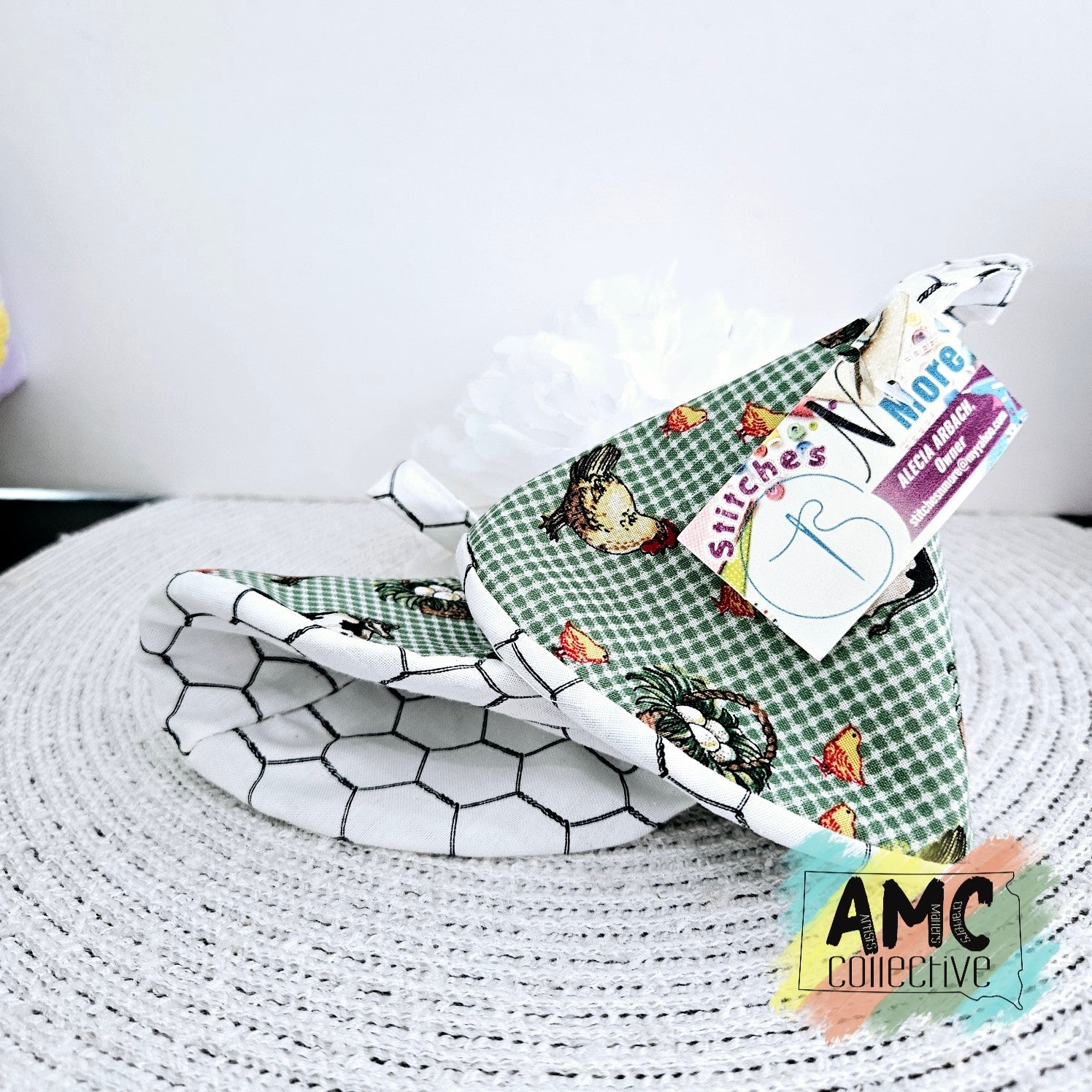 Impress your guests with these hot pan holders! Cone shaped for easy handle manipulation. Cute barnyard animal pattern!