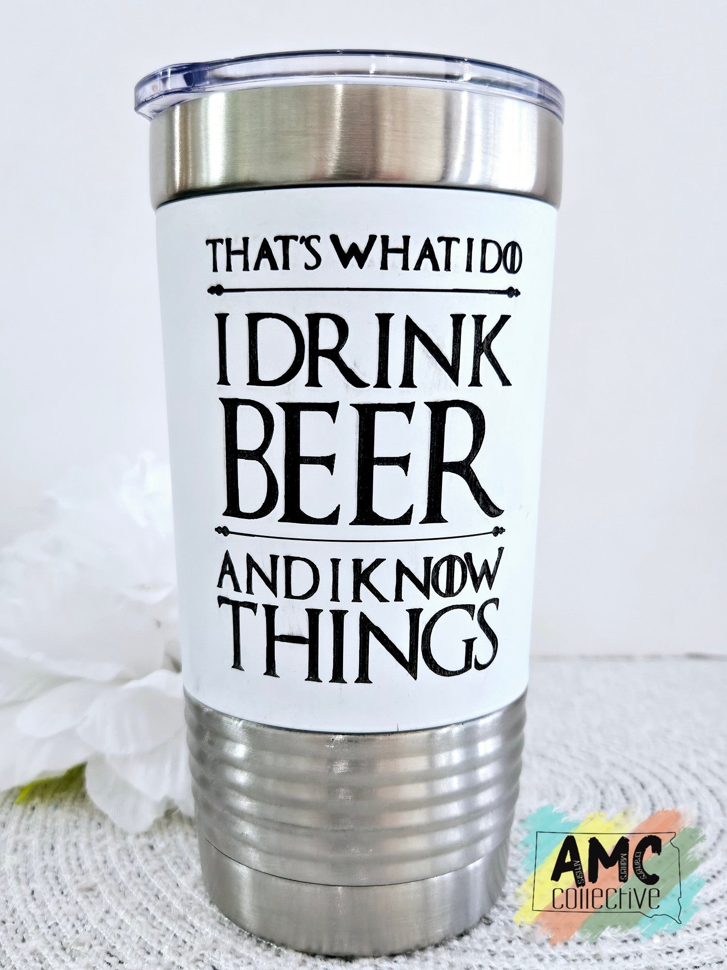 Introducing the Drink Know Things Tumbler, the perfect accessory for any beer lover. With its clever word play and quirky design, this tumbler will make you the talk of the party.