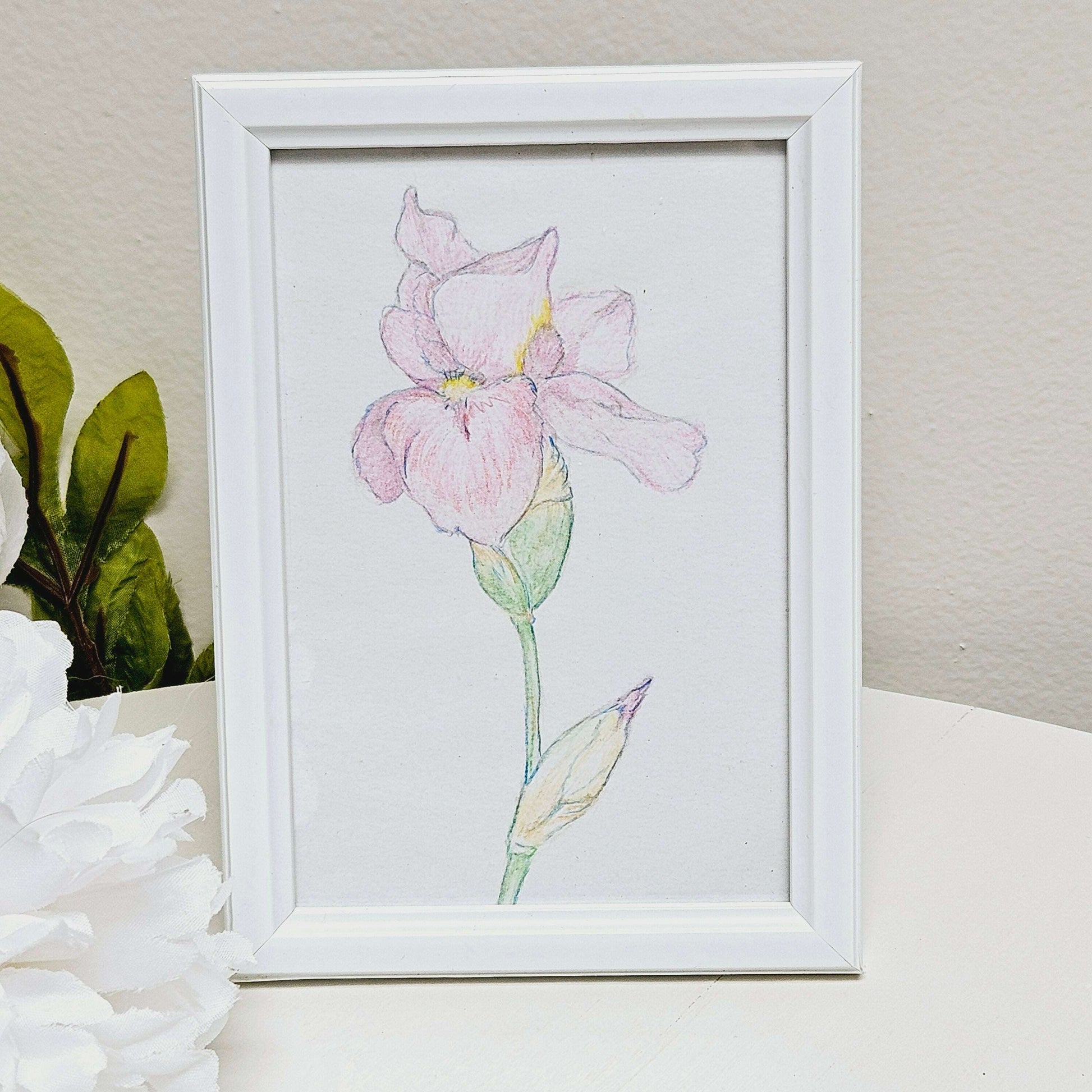 Introducing our delicate Pink Iris Colored Pencil Drawing, framed in a beautiful white frame. The pink iris adds a touch of elegance and sophistication to any wall or desk. Displayed on an easel back, this 4x6 drawing is perfect for any art lover. Upgrade your space with this premium piece.