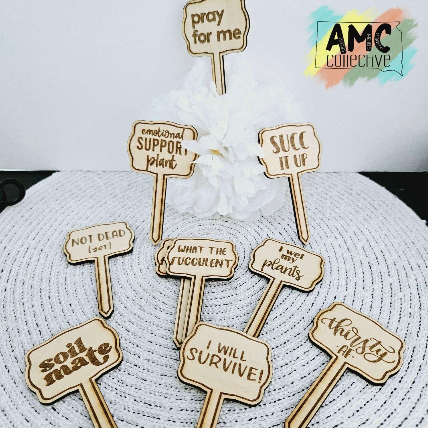 Elevate your garden game with our Plant Stakes. Made from high-quality wood, these stakes are both durable and whimsical. Engraved with witty plant puns, they are sure to bring a smile to your face while providing sturdy support for your plants. Perfect for any plant lover or garden enthusiast.