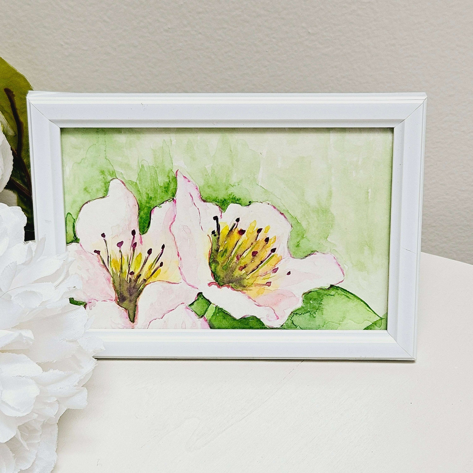 This exquisite 4x6 watercolor painting features delicate white flowers, adding a touch of grace and elegance to any room. With the included easel backing, it can be displayed on a wall or desk, making it a versatile and timeless piece of art. Perfect for those who appreciate the finer things in life.